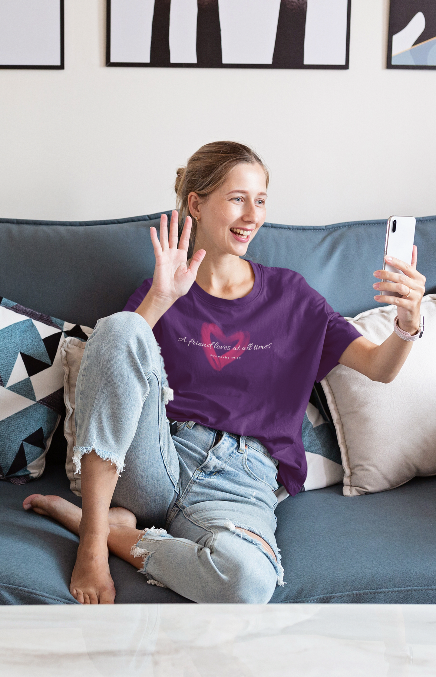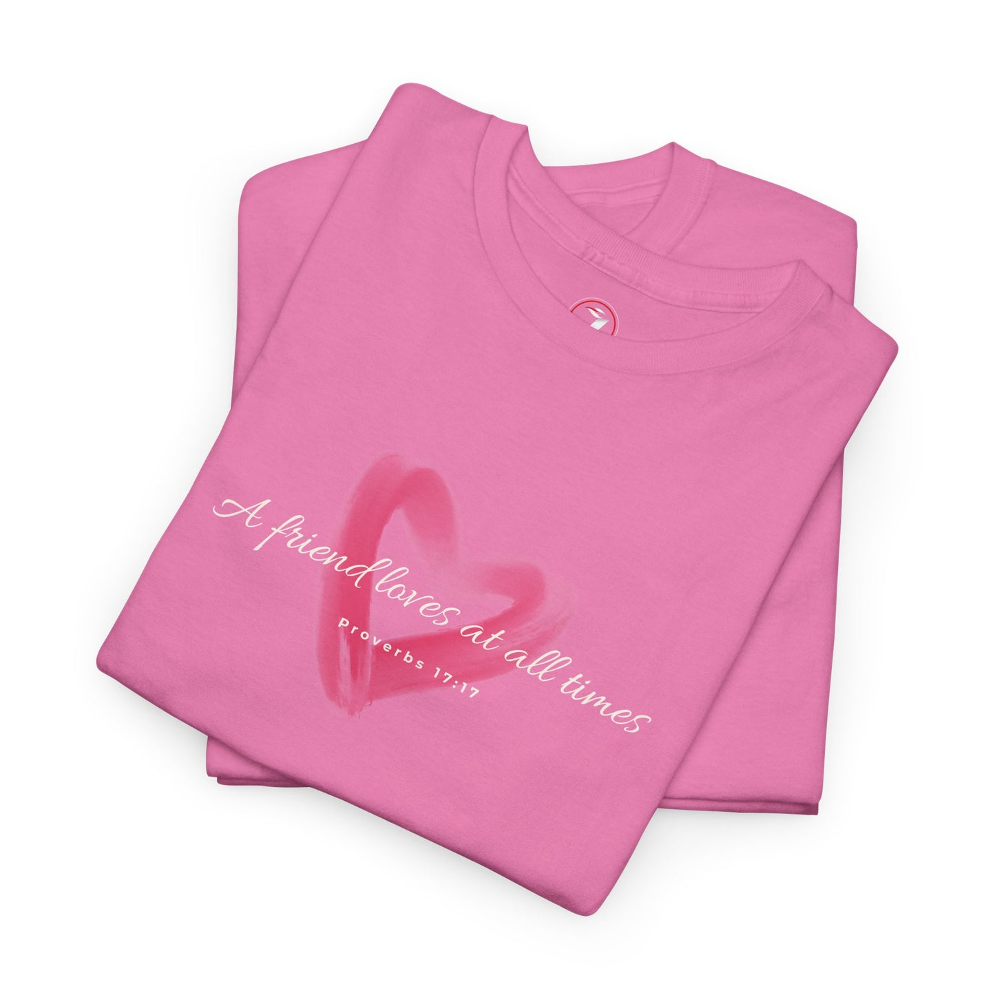 Wear your heart on your sleeve (literally) with this inspiring tee. "A friend loves at all times" - a timeless truth that will remind you to cherish the loyal bonds in your life.