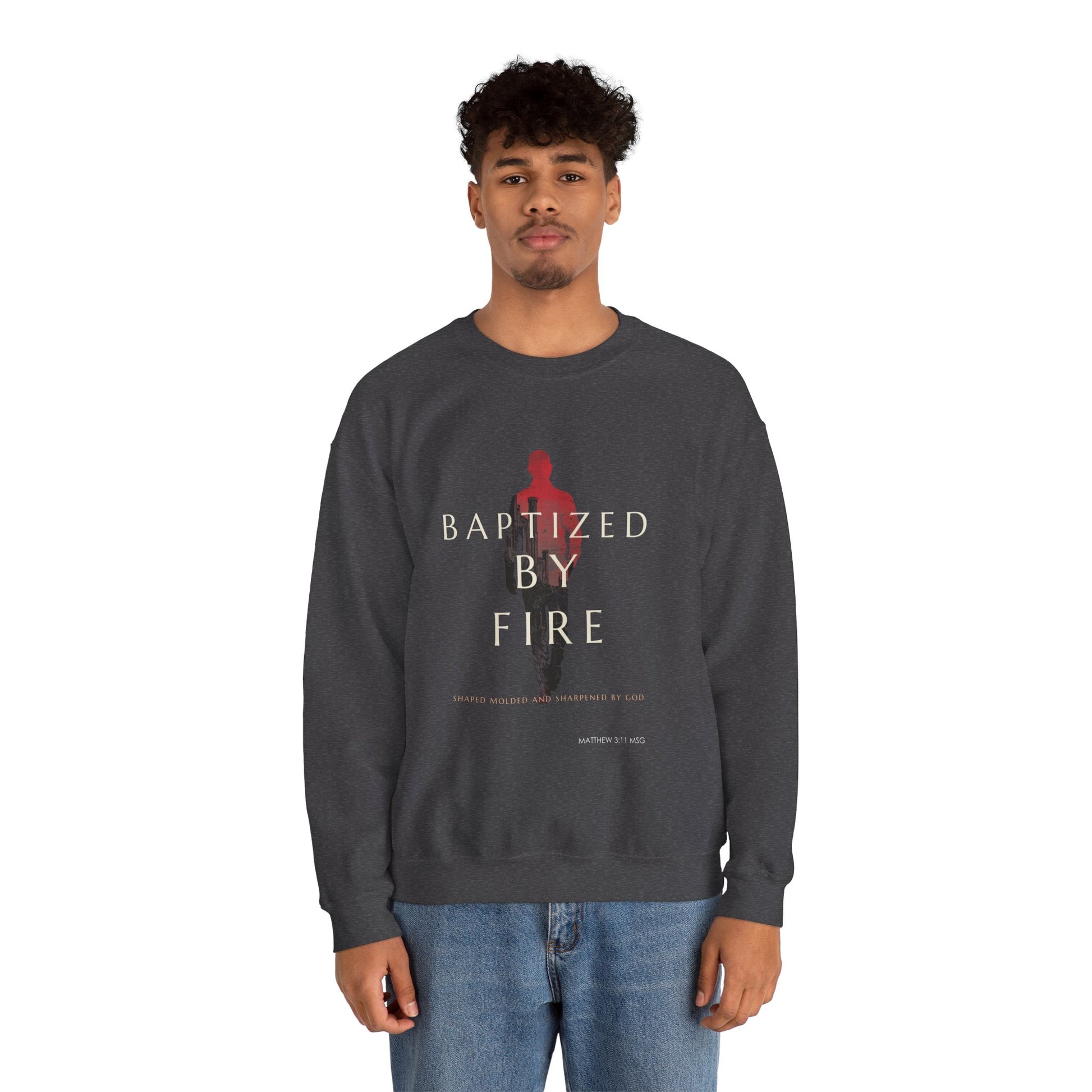 Embrace the transformative power of faith with the "Baptized By Fire" Unisex Crewneck Sweatshirt. This stylish, comfortable top features a bold graphic that captures the essence of Matthew 3:11, reminding you and all who see it of the purifying, empowering work of the Holy Spirit.
