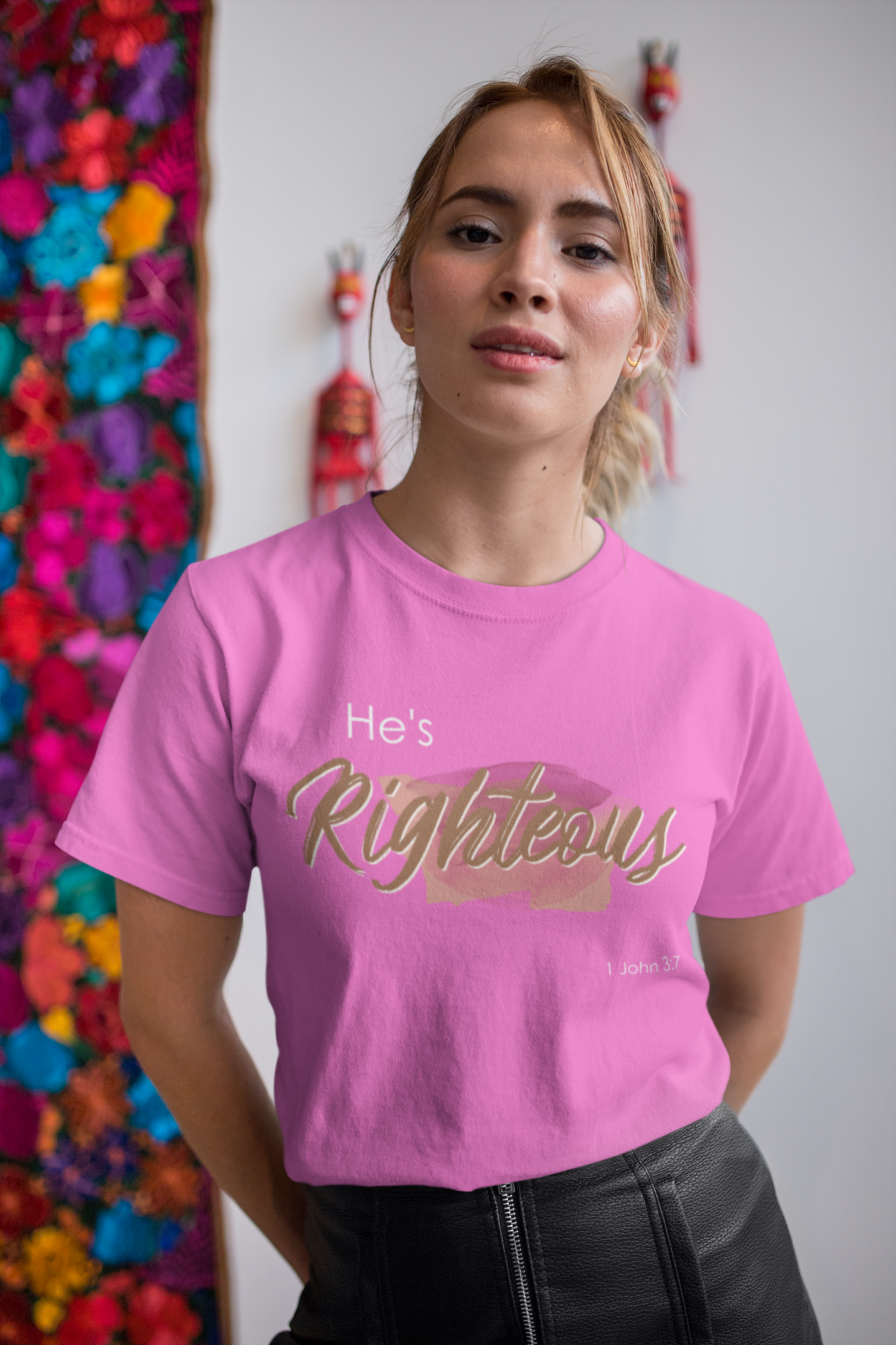 "He's Righteous" - a bold declaration of your unshakable beliefs. This premium cotton tee, inspired by 1 John 3:7, is a testament to your unwavering commitment to what is just and true.